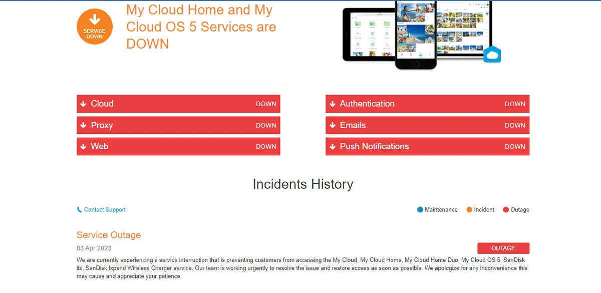 According to their incident report, “We are experiencing a service interruption preventing customers from accessing the My Cloud, My Cloud Home, My Cloud Home Duo, My Cloud OS 5, SanDisk ibi, SanDisk Ixpand Wireless Charger service.”