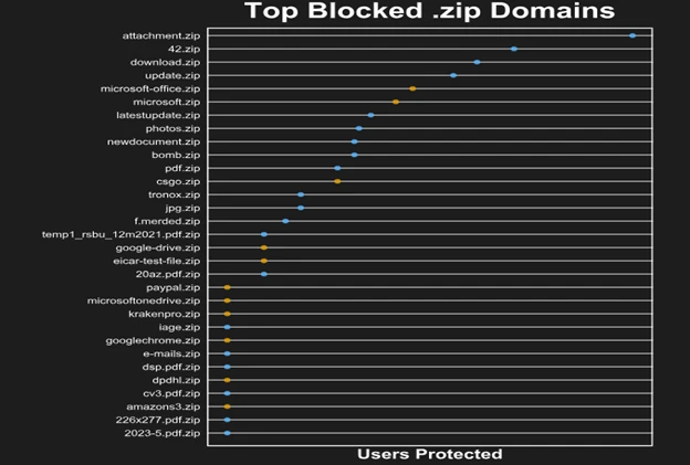 Avast analysis reveals that one-third of the top 30.zip domains blocked by their threat detection engines misuse the names of well-known IT firms like Microsoft, Google, Amazon, and Paypal to deceive users into thinking they are files from reputable businesses.
