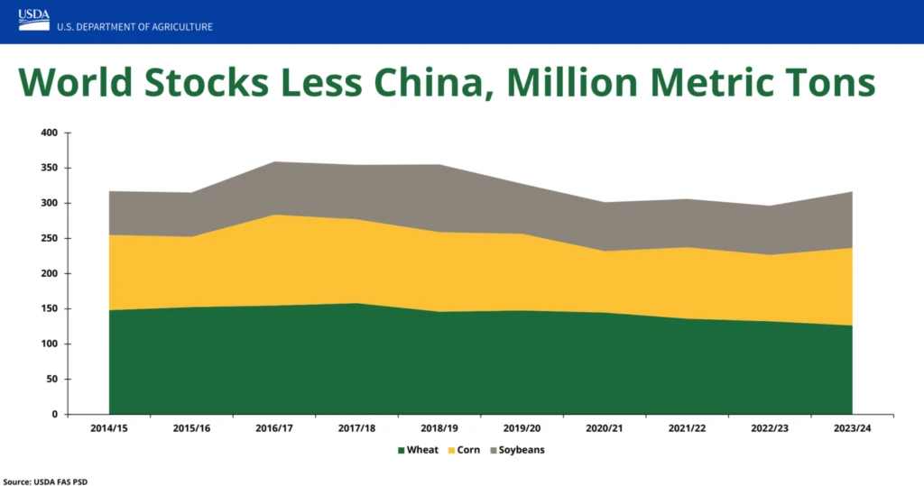 The remarkable ability of our global food system to meet the supply challenge has help create a food security picture very different from the worst fears of hyperbolic headlines. The below chart graphically demonstrates this by plotting historical post-harvest wheat, corn and soybean stocks (commodities for sale by the farmers and others; also referred to as ‘reserves’).