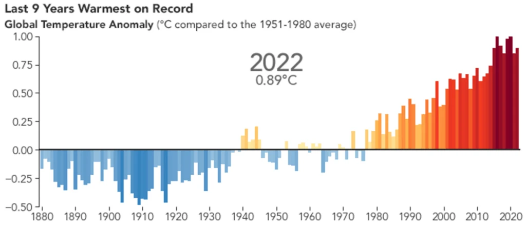 The image below shows global temperature anomalies in 2022, which tied for the fifth warmest year on record. The past nine years have been the warmest years since modern recordkeeping began in 1880.