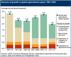 “Since the 1960s, global agricultural output has increased at an average annual rate of between 2 and 3 percent (in volume terms, holding prices constant)…. Output growth was high in the 1960s (think Norman Borlaug’s ‘Green Revolution’), slowed in the 1970s (due to severely cold weather) and 1980s, accelerated in the 1990s and 2000s, but slowed again in the most recent period …. In this latest period (2011–21), global output of total crop, animal, and aquaculture commodities grew by an average rate of 1.94 percent per year.”