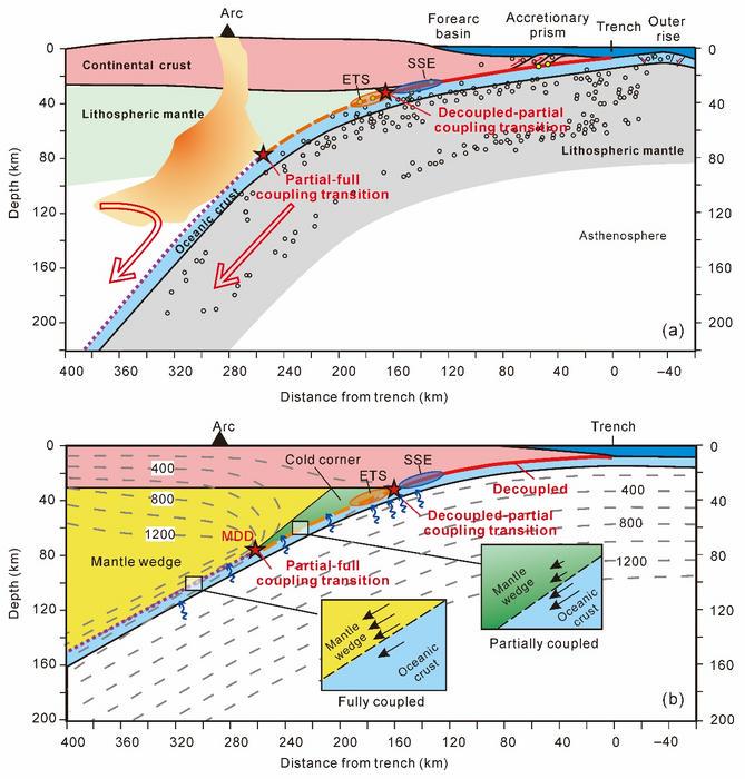 Above the MDD, the cool subducting slab induces a “cold corner” within the mantle wedge forearc, where reduced temperatures suppress ductile deformation. Below this decoupling depth, viscous coupling prevails, with the slab and mantle wedge moving in concert. This results in enhanced corner flow patterns that increase heat transfer, warming the slab surface significantly. Intriguingly, this MDD depth coincides with the maximum exhumation depth of metamorphic rocks found along the oceanic subduction interface, highlighting a potential linkage between thermal-mechanical transitions and tectonic exhumation processes. The underlying mechanisms governing the MDD remain subjects of ongoing investigation, complicated by variability in subduction geometry and thermal evolution.