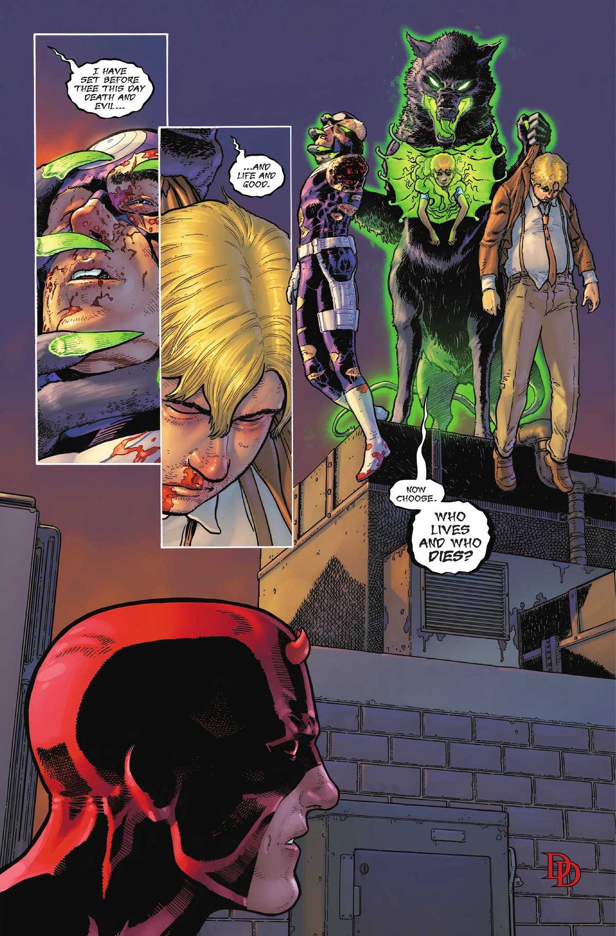 Daredevil loses the fight with Wrath and passes out, later waking up on a rooftop. Daredevil detects two familiar heartbeats in the area and races to find them. At the top of the building, Jason has taken Foggy and Bullseye (still missing an arm thanks to Wrath) hostage. Both men’s heartbeats are weak and Daredevil determines they aren’t long for this world. Jason stands above Matt, holding Bullseye in one hand and Foggy in the other. Wrath forces Daredevil to pick which one will live and which one will die.