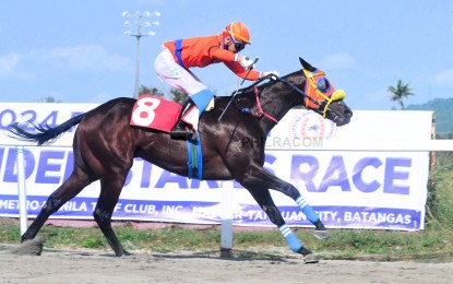 CHAMPION. Top favorite Worshipful Master of James Anthony Rabano on the way to the finish line during the 2024 Philracom 3YO Maiden Stakes at the Metroturf in Malvar, Batangas on Sunday (March 17, 2024). The bay colt's connections earned PHP720,000. (Philracom photo)