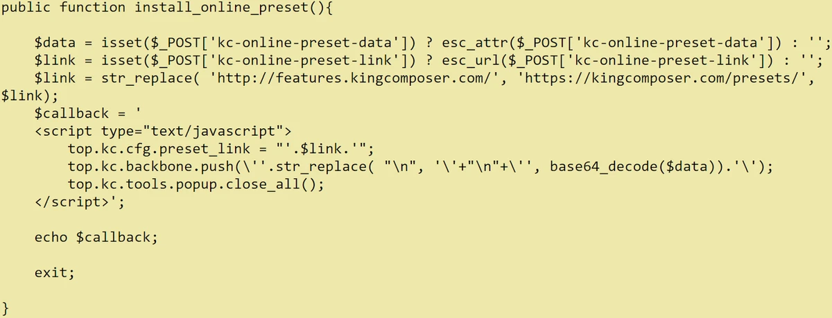 This vulnerability was discovered on June 25 and operates in the Ajax functions that are used by the plugin to complete page builder characteristics. However, one of the Ajax functions were not in current use, yet it can be installed by assigning a POST application to a script named admin-ajax.php with an operation parameter set to kc_install_online_preset.