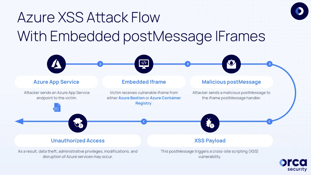 The Azure Bastion Topology View SVG exporter or the Azure Container Registry Quick Start were found to be vulnerable to manipulation by a specifically constructed postMessage in a proof-of-concept (PoC) presented by Orca. This allowed the payload of an XSS to be executed.