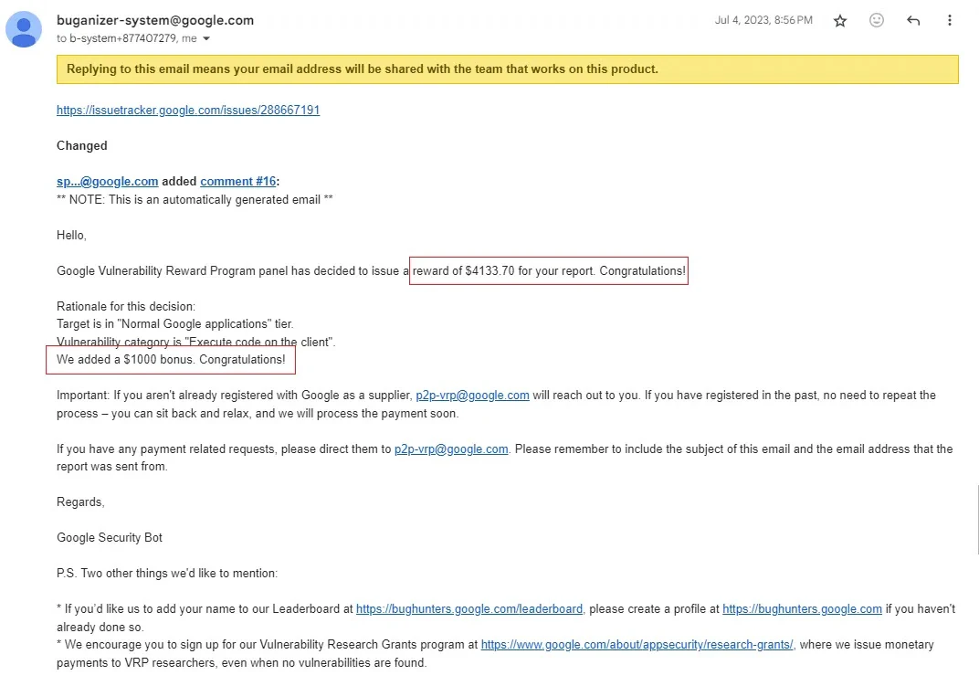 The team responded quickly, upgrading the issue’s priority and severity levels and expressing appreciation for the “Nice Catch!” The researcher was rewarded $4,133.70, including a $1,000 bonus for their comprehensive report and proof of concept scripts.