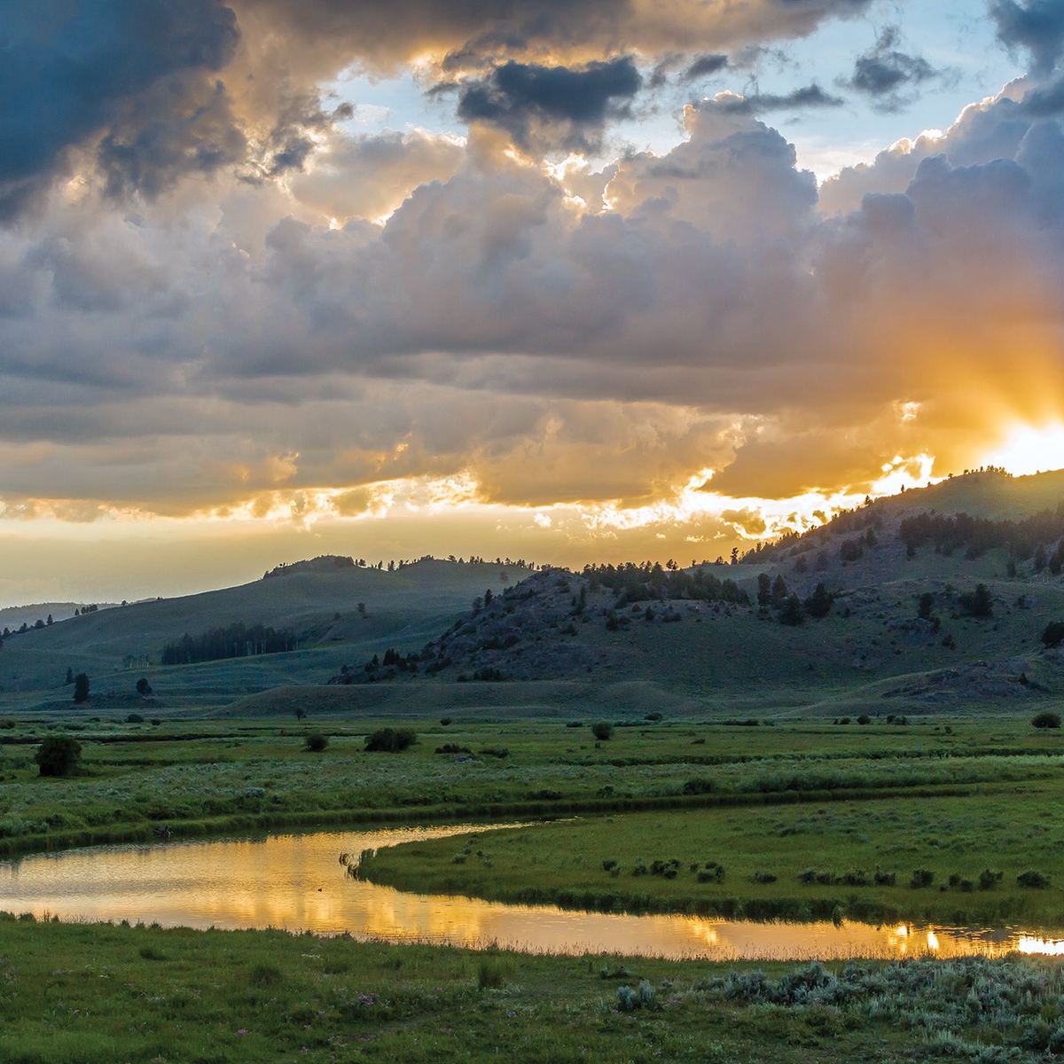 Spacious plateau replaces hilly landscape; valley views stretch endlessly to the N (winter range for elk and bison); distant Gallatin Range forms a rugged backdrop to the NW