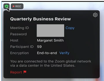 At this point, meeting participants also can report a disruptive user directly from the Zoom client by clicking the top-left Security badge (as shown below). Account owners and admin can allow reporting capabilities for non-hosts in their web settings.